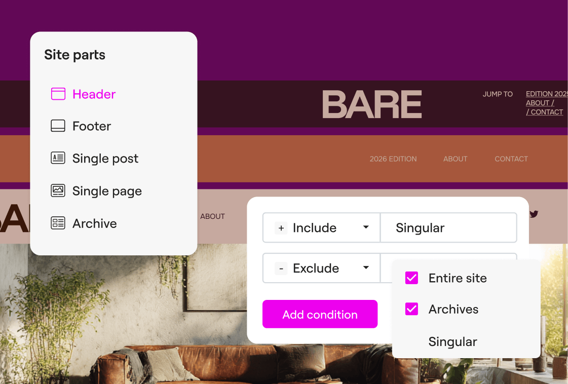 Review and edit each component of your site individually: Headers & Footers, Post, Archive, product pages and more.